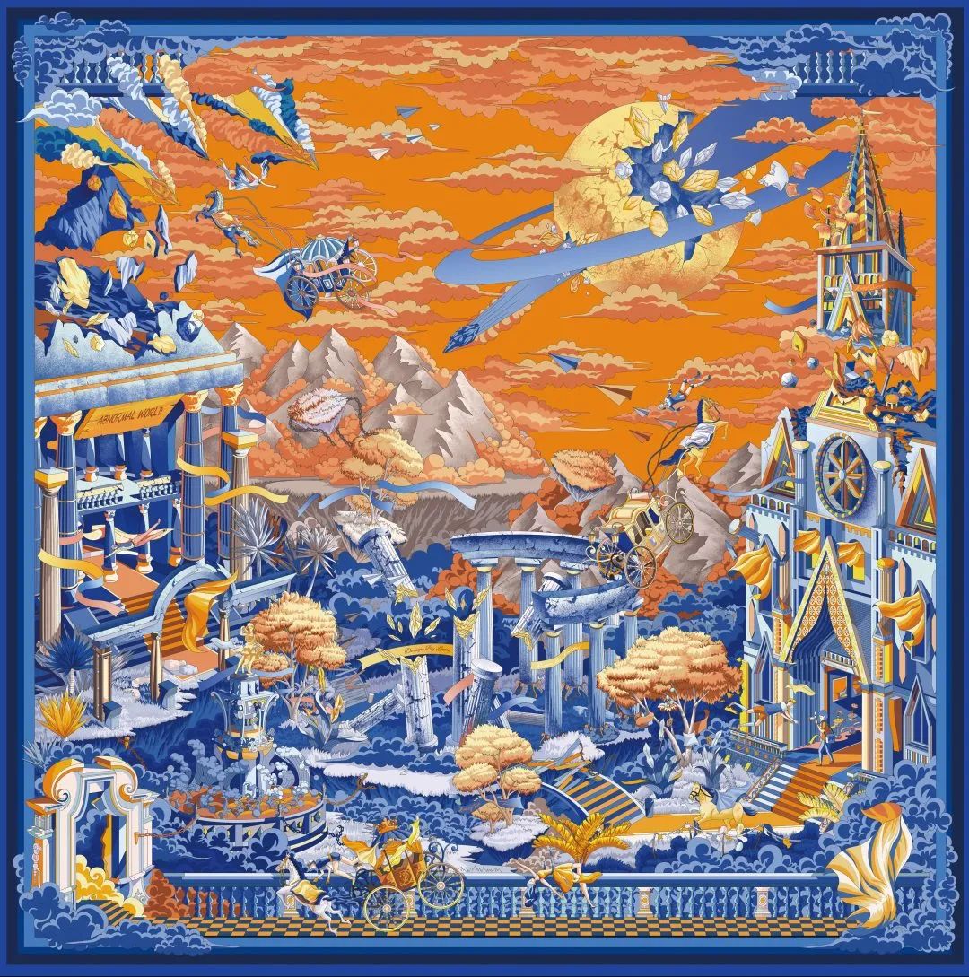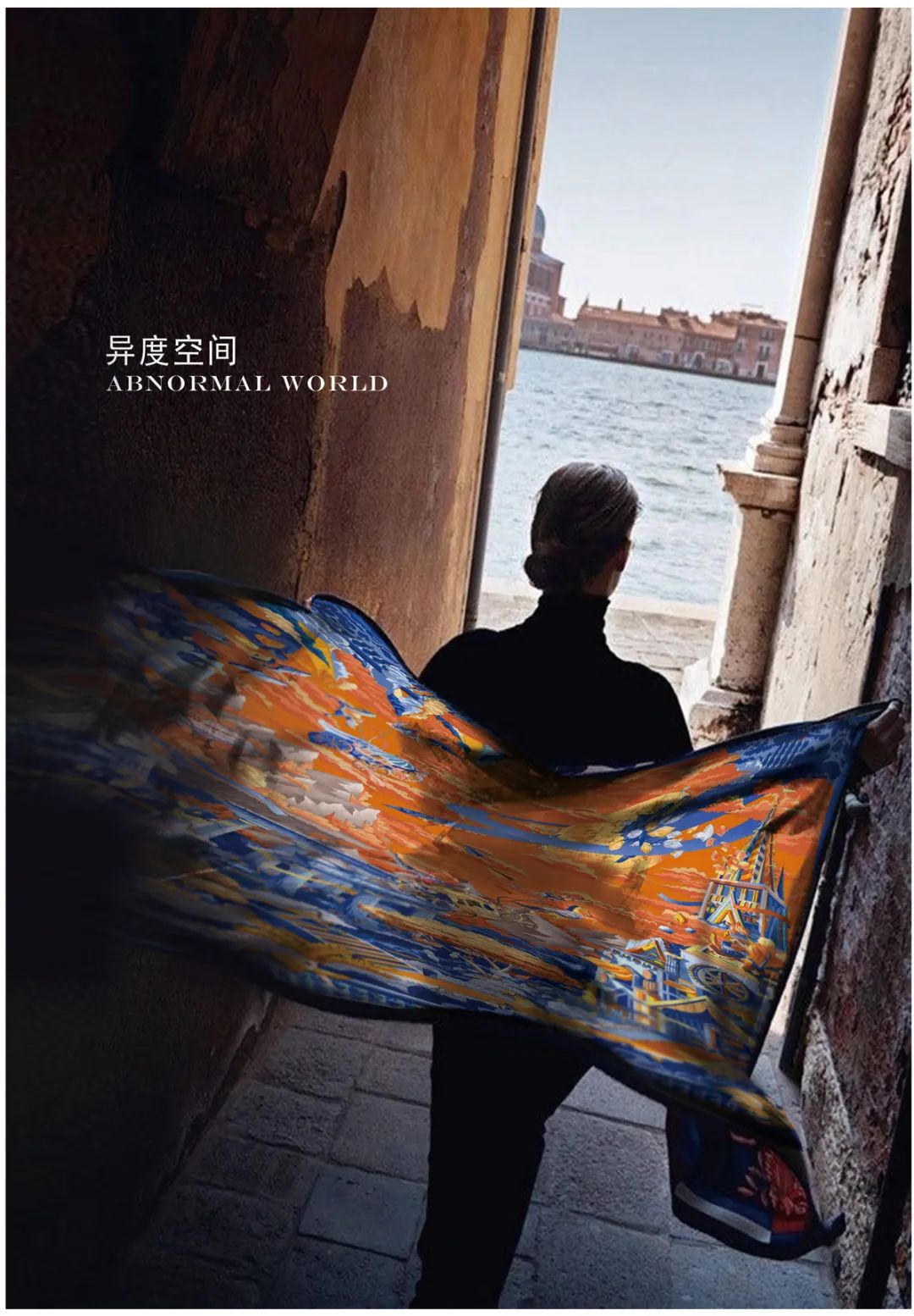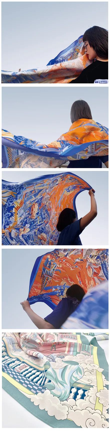 当然设计只有依附于精湛工艺,才能得到充分发挥,因此实地打样与面料选择成为了异度空间作品的必修课。作品在设计的过程中,材料色彩和构图采用一花两色的效果,通过折叠就能产生两种不同的佩戴体验,但是两种完全相撞的颜色便意味着印花工艺的高要求,因此在食物的制作过程中,首先遇到的难题便是是色彩得不到充分发挥,为了改善颜色问题,作者对两幅丝巾上的所有色彩,用潘通色卡进行一对一打样来降低色彩的问题,以此满足工业化批量生产的同时又符合高标准的审美需求,作品从40余种不同厚度质感与卷边工艺的成品小样中进行试戴水洗等测试,最终确定的斜纹绸面料不公是光泽还是硬度都达到最佳。
