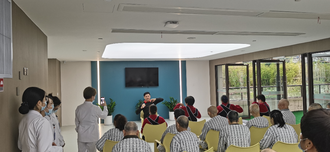 一个温暖和煦的秋日,他亲自带领社团四位优秀的成员走进我市一家老年医院教学。面对坐在轮椅上行动不便的老人们,杨老耐心地一遍遍反复示范:“动作要轻,幅度要小,不要超过自己能承受的范围。”四位成员则在一旁辅助纠正老人们的动作。