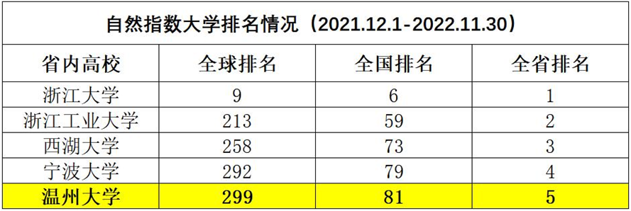 自然指数(Nature Index)于2014年11月首次发布,是依托于全球顶级期刊(《自然》系列、《科学》《细胞》等82种自然科学类期刊),统计各高校、科研院所在国际上最具影响力的研究型学术期刊上发表论文数量的数据库。运用这个数据库,可以根据各机构的论文发表数量及类别来进行排名和期刊索引。目前,自然指数已发展成为国际公认的能够衡量机构、国家和地区在自然科学领域的高质量研究产出与合作情况的重要指标。