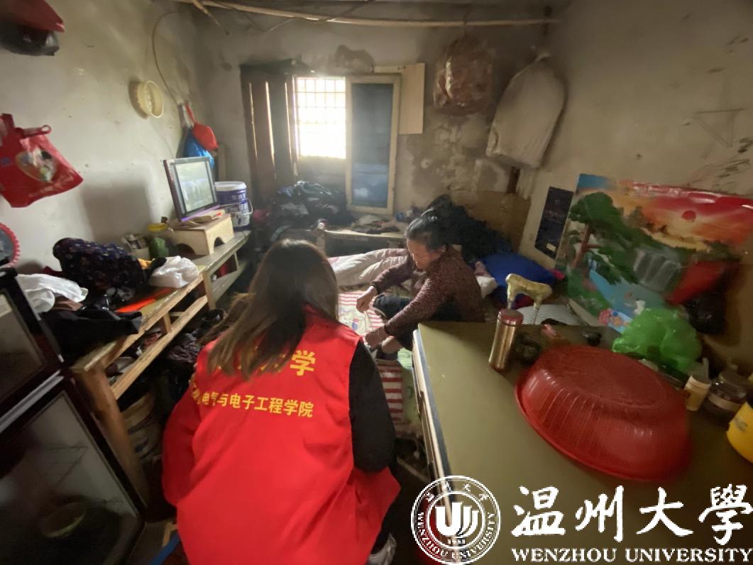 师生志愿者们身穿红色马甲,帮忙清理屋内卫生,将屋内物件摆放整齐,深入房前屋后,清扫枯叶、清除杂草,摆放好绿植……志愿者们与曾叔夫妇亲切交谈,关心着他们的身体状况,叮嘱他们注意用电防火安全。