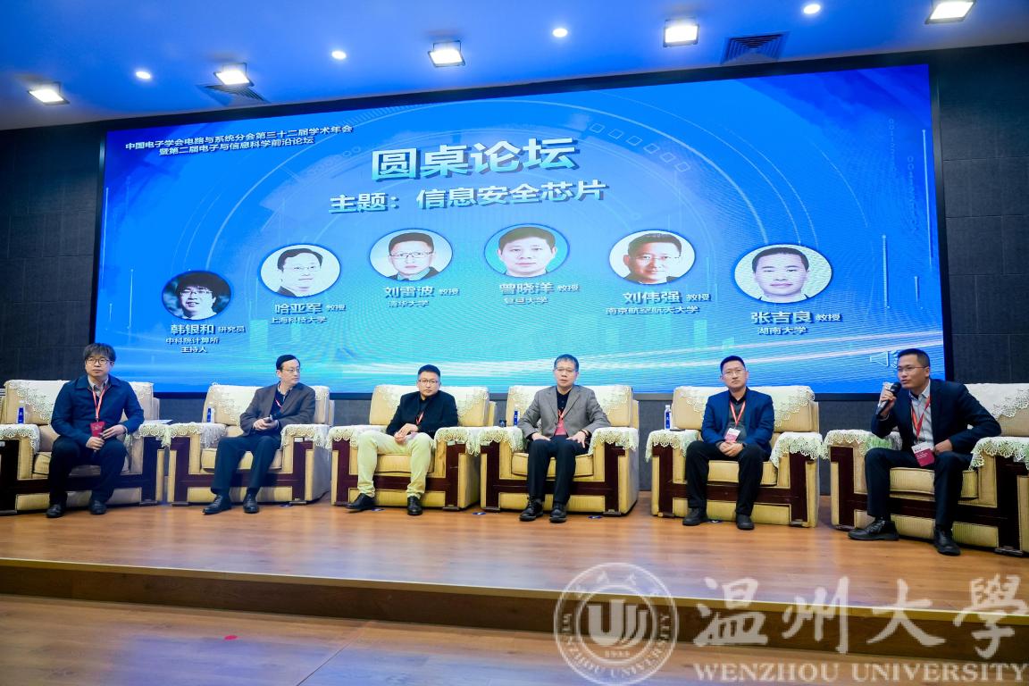 大会圆桌论坛环节,在中国科学院计算所研究员韩银和的主持下,上海科技大学教授哈亚军、清华大学教授刘雷波、南京航空航天大学教授刘伟强、复旦大学教授曾晓洋、湖南大学教授张吉良围绕信息安全芯片主题做交流和分享。