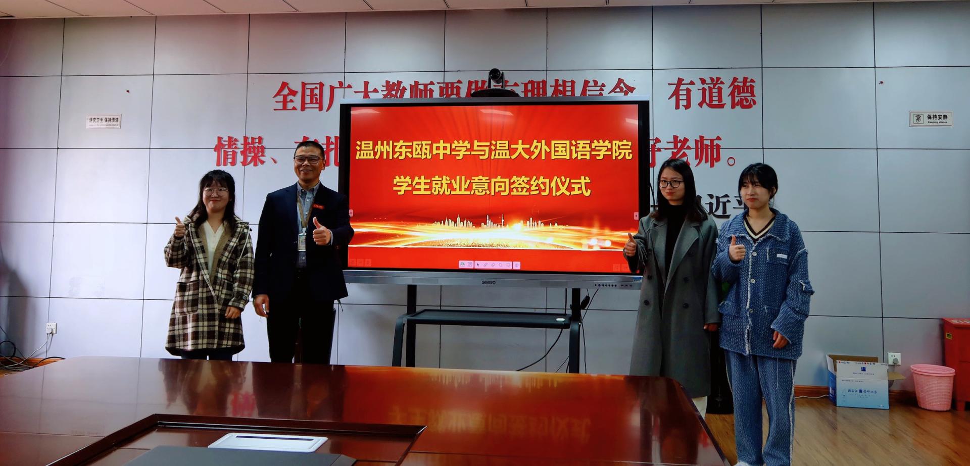 为进一步推进2023届高校毕业生春季促就业攻坚行动,助力毕业生高质量、精准就业,日前,日本色情片 外国语学院院长叶苗带队走访温州东瓯中学,开展“访企拓岗促就业”活动,助力三名毕业生当场签订就业意向协议书。