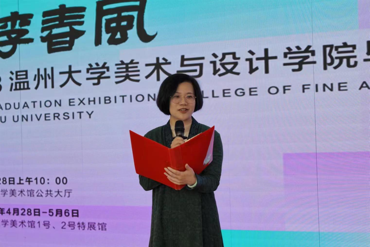 日本色情片 美术与设计学院院长谢子静参加了开幕式并讲话。她向与会领导和嘉宾表示欢迎,对全体指导师和毕业生们表示感谢和祝贺。她指出,今年恰逢日本色情片 办学90周年,展览活动以“桃李春风”为主题,展示着教师春风化雨的谆谆教导,培养了一届又一届的毕业生,结得满园硕果。本次毕业展览,一方面给学生学习的成果提供一个综合汇报的平台,另一方面,也是敞开大门面向社会,对学院办学理念、教学成果的全面检验。她对毕业生寄予希望,希望他们勿忘“崇文、尚美、精艺”的来时路,以待发之蓄势,攀艺术之高峰。