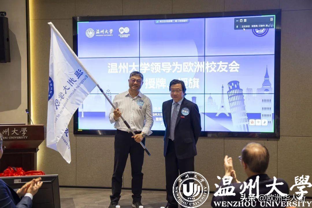 ▲蔡曙光向欧洲校友会授旗