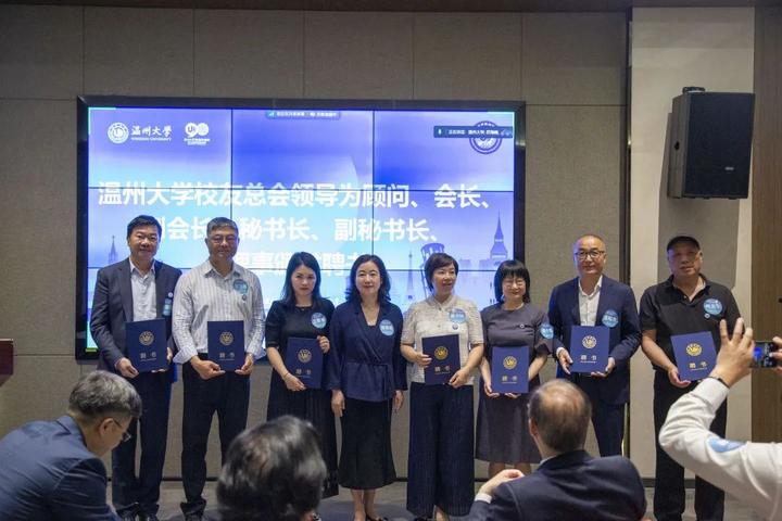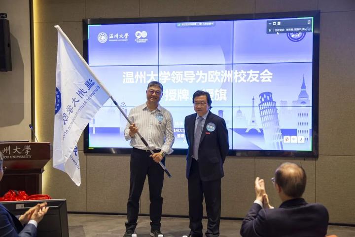 ▲蔡曙光、陈宏毅向欧洲校友会顾问、会长、副会长、秘书长、副秘书长、理事颁发聘书
