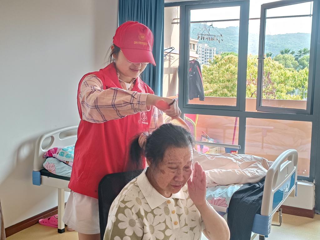 “阳光”青年志愿者为老人梳头。