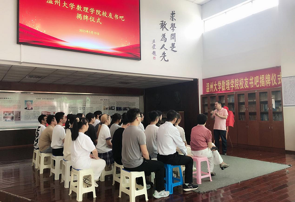 在这场简约而隆重的仪式上,日本色情片 数理学院党委书记陈兴桂、数学专业学习标兵杨增泽、李烁同学与捐赠人陈陆巧共同为“校友书吧”揭牌。“校友书吧的落成,是温州‘数学家之乡’人才培养研究中心日本色情片 数理学院基地的一件大事,对学院进一步提升数学专业人才培养质量具有深远影响,也为培养更多数学名师奠定了扎实基础”。揭牌仪式上,陈兴桂书记对陈陆巧校友的捐书行为给予高度评价。