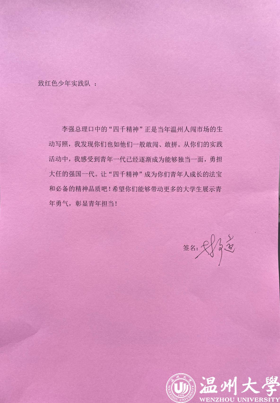 温州市乐清市柳市职业技术学校校长、书记林文远谈到:“李强总理口中的‘四千精神’正是当年温州人闯市场的生动写照,我发现你们也如他们一般敢闯、敢拼。从你们的实践活动中,我感受到青年一代已经逐渐成为能够独当一面,勇担大任的强国一代。让‘四千精神成为你们青年人成长的法宝和必备的精神品质吧!希望你们能够带动更多的大学生展示青年勇气,彰显青年担当!