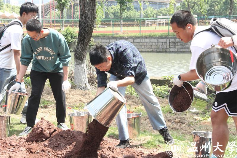 在现场,同学们热情高涨,分配职责,互相帮助。清石除草、挥锹铲土、扶树填坑、踏土夯苗……炎热的天气蒸出了同学的汗水,虽然疲惫,但是亲身体验劳动实践带来的快乐可以抵去万千酸痛。一锄一耙,松土声与搬运声构成了美妙的乐章。待到黄昏日落之时,坐在杨柳荫蔽下,吹着微风享受劳作后舒适的休憩,每个人脸上都露出了满足的笑容。