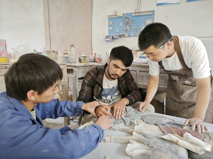 据悉,仰义街道于2022年成立崇林斋彩石镶嵌“共富工坊”,主要采用石雕、浮雕与花板雕刻相结合的技法制作屏风、茶具、首饰盒等文创作品。该“共富工坊”占地1000余平方米,通过村企共建,吸纳周边村社富余劳动力20余名,以产教合作、定岗实习及“学徒制”等方式,培养实用型、技能型彩石镶嵌工匠,打造党建联建下的就业模式。