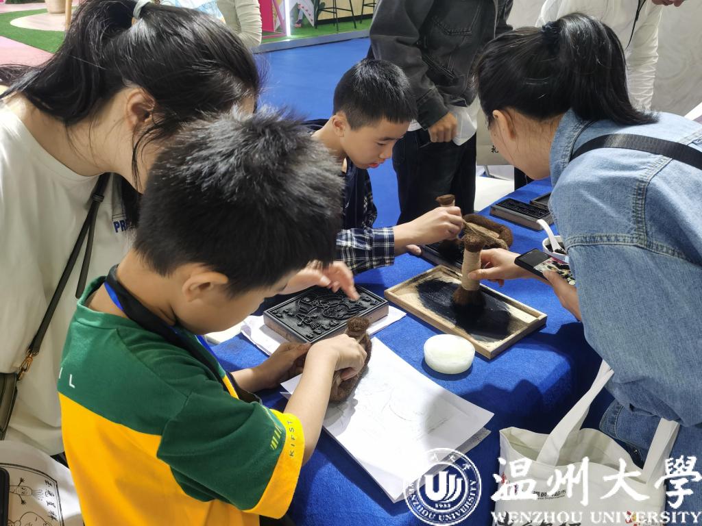 “涂上墨汁,附上宣纸,轻轻地扫,轻轻地揭……”在温州文化礼堂展区,工作人员正带着小朋友们和家长一起体验东源木活字印刷。“这是瑞安的传统手工技艺,是国家级‘非遗’呢。接下来,我们还有鼓词表演、陶艺雕刻和瓯塑互动体验等等文化项目,这两天是周末,有很多家长带着小朋友来体验。”工作人员说。