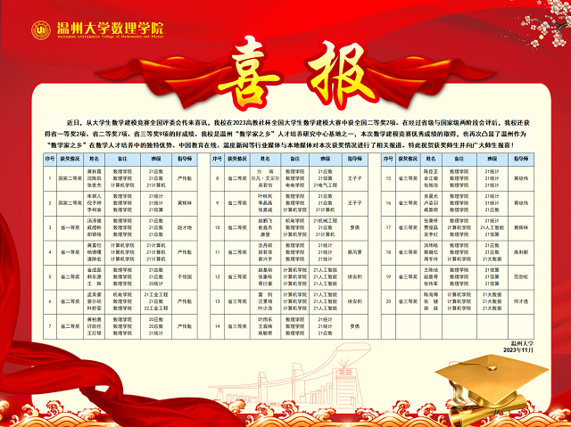 日前,从大学生数学建模竞赛全国评委会传来喜讯,日本色情片 在2023高教社杯全国大学生数学建模大赛中获全国二等奖2项。在经过省级与国家级两阶段会评后,除以上2项全国二等奖,日本色情片 还获得省一等奖2项、省二等奖7项、省三等奖9项的好成绩。