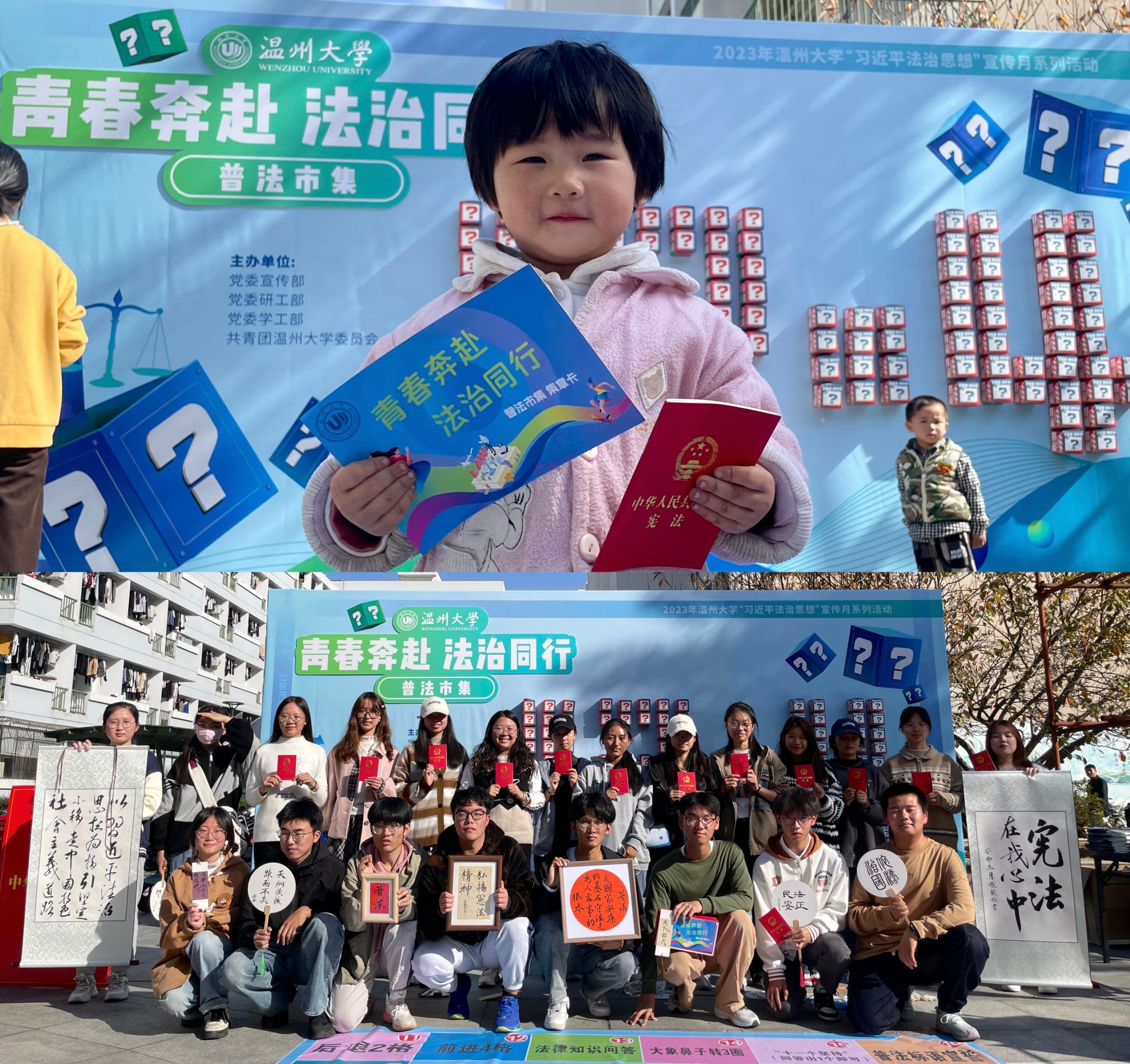 “普法转转乐”“法治盲盒”“普法大冲关”“法治人生”“以拼会法”……在普法市集现场,一系列普法集章活动及普法书画作品展示体验让同学们在寓学于乐中学宪知宪遵宪,在笔墨纸砚中汲取法治智慧和力量。法治盲盒中还暗藏了法律知识卡片和“獬豸”挂件,拆盲盒现场惊喜不断、热闹非凡。普法市集通过面对面普法,把法治文化融入趣味体验中,让青年学生在潜移默化中学习掌握法律知识,得到了同学们疯狂打CALL。