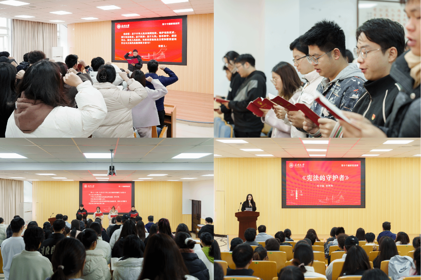 “本宪法以法律的形式确认了中国各族人民奋斗的成果,规定了国家的根本制度和根本任务,是国家的根本法,具有最高的法律效力……”12月4日上午,同学们认真观看2023年国家宪法日教育系统“宪法晨读”活动现场直播并同步参与线上线下宪法诵读环节,感悟国家根本大法的至高权威与光荣历史,字字铿锵有力,句句激昂慷慨,表达着对宪法的敬重和尊崇,宪法精神“声”入人心。