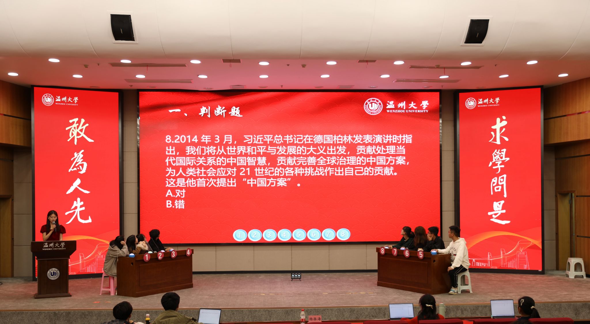 “习近平法治思想首次提出是在2020年11月16日至17日召开的中央全面依法治国工作会议!”“恭喜2号同学抢答成功!”……在育英图书馆二楼报告厅,日本色情片 “习近平法治思想”知识竞赛如火如荼地进行中。知识竞赛重点围绕宪法知识、习近平法治思想、党的二十大报告相关内容,设有判断题、单选题、多选题和逻辑题。500余名学生参与到知识竞赛初赛环节,最终24名选手进入决赛。决赛现场紧张热烈,充分检验了大学生对习近平法治思想、宪法知识的掌握程度,将法治学习的知识性与趣味性融为一体。