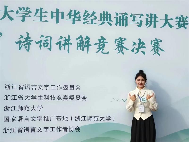 为了提升自己的专业素养,沈馨怡除了阅读近100本的国学书籍,还踊跃参与了国学相关的多项比赛,并取得了成绩。如在第五届中华经典诵写讲大赛“诗教中国”诗词讲解大赛荣获三等奖,在浙江省第十一届诗词讲解竞赛本科组一等奖……