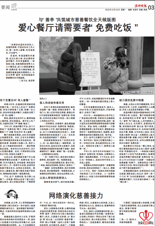 并且,温州人在做慈善的时候,还一直进行润物细无声的传播。“免费吃饭”公告牌上所说的:“等你以后有了能力或已渡劫难关,请力所能及帮助一下需要帮助的人”。这就是最好、最有效的慈善宣传。