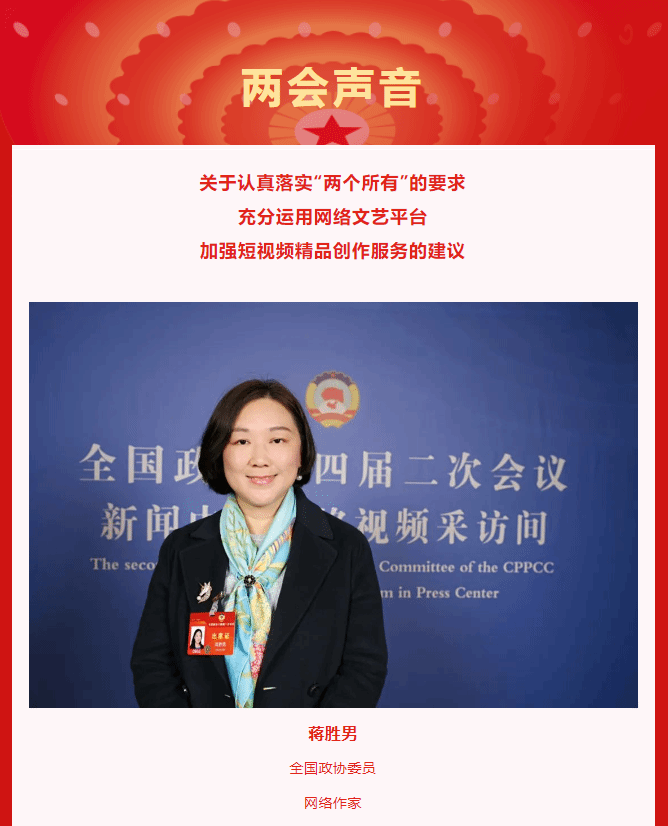建议有关部门面向主要网络视频直播平台,征集网络文艺优秀作品,从思想性、艺术性、传播力等多个维度,定期开展评比、展示、宣传,树立网络文艺作品标杆,发挥其示范作用,使得优秀的网络文艺作品能在更权威的渠道广泛传播。