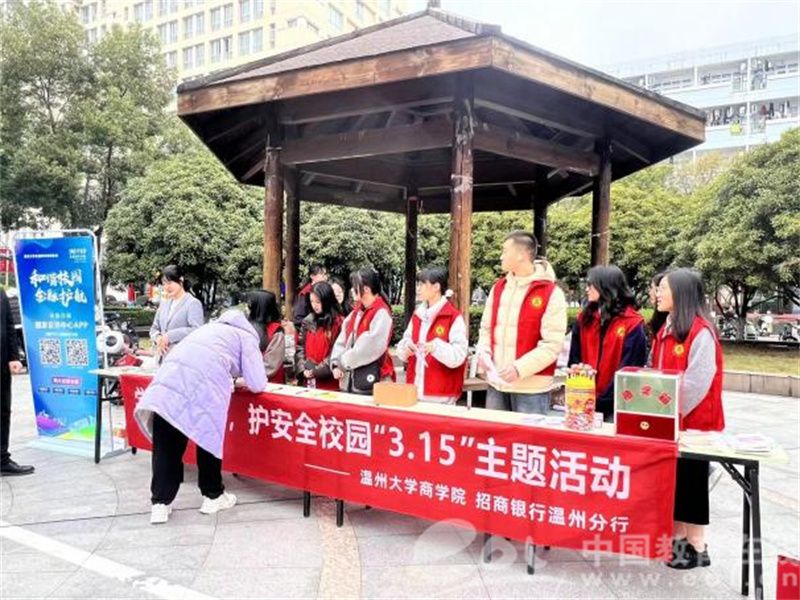 一次主题宣传。“当同学们遇到消费者权益被侵犯时,请拨打电话12315进行合理维权……”,协会联合招商银行温州分行开展一场“学消保知识,护安全校园”主题宣传活动。活动现场,协会成员与银行工作人员采取悬挂宣传标语、发放宣传手册等多种形式向同学们普及“国际消费者权益日”的发展历史与意义。