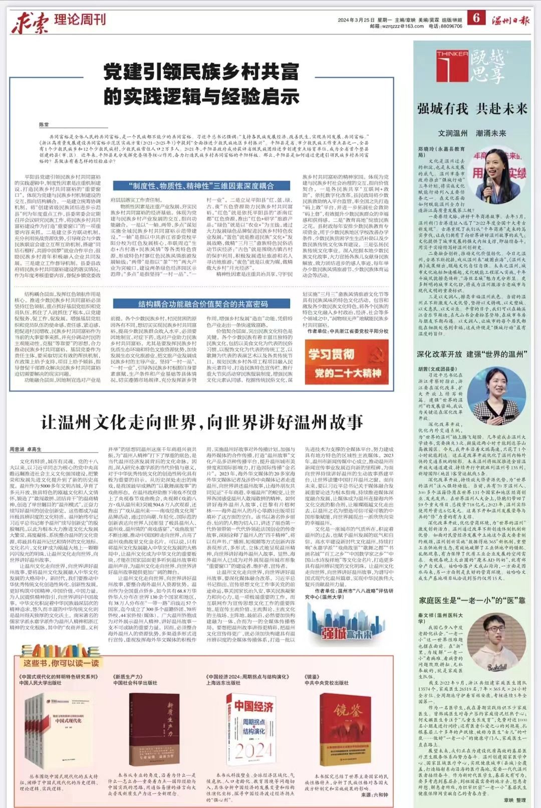 文化是一座城市的气质所在,积淀着温州的过去,也赋予温州发展的底气和自信。高水平建设新时代文化温州,持续打响“永嘉学派”“戏曲故里”“歌舞之都”“书画名城”“百工之乡”“中国数学家之乡”“中国山水诗发祥地”等文化金名片,打造更多具有温州辨识度的文化明珠。让温州文化走向世界,向世界讲好温州故事,为谱写中国式现代化温州篇章,实现中华民族伟大复兴贡献温州力量。