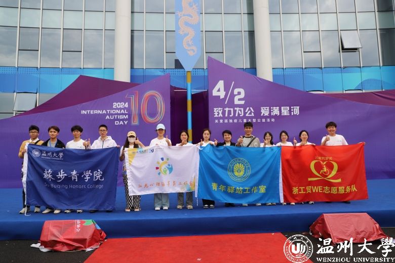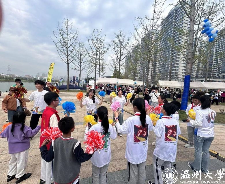 3月30日,在第十七个“世界孤独症关注日”来临之际,由益起行组织发起的“致力为公,爱满星河”关爱孤独症儿童大型公益活动现场,大学生助残志愿服务队在温州市龙舟运动中心,给300户孤独症家庭提供韵律啦啦操课堂体验。