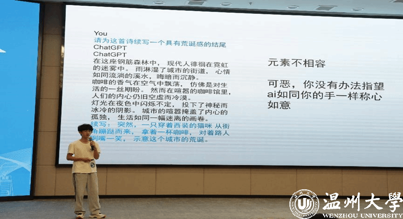AI诗词环节也是精彩纷呈。选手们使用了诗三百、ChatGPT、讯飞星火、百度文库AI文档助手等AIGC工具辅助作诗。该赛道侧重表现AI作诗过程,选手通过AI视频、AI语音朗诵等多样的表现形式进行诗词展示。所有选手呈现完毕后,观众仍意犹未尽,主持人于是使用“文心一言”和“通义千问”两款AI工具,当场以“诗词大会”和“喜迎党代会”为主题作诗。不到5秒钟的时间,两首优美的七言绝句就呈现在观众面前,带领大家现场体验了一回AI作诗的快乐。最终陈彦霖同学在此环节拔得头筹,贾宝尔同学获得二等奖,周文茜同学夺得三等奖。