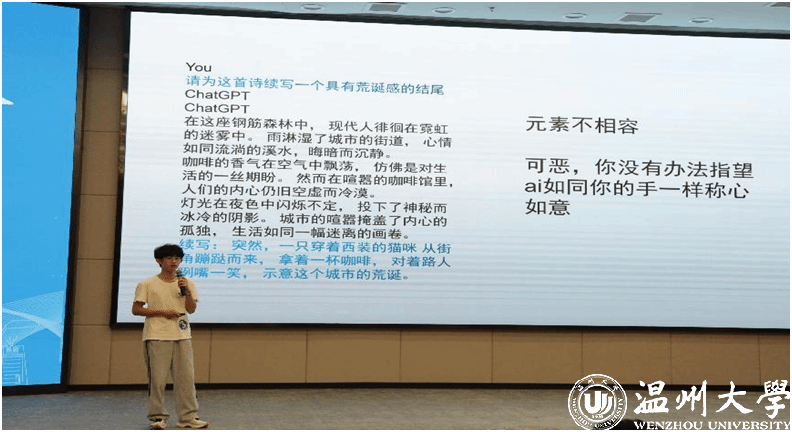 AI诗词环节也是精彩纷呈。选手们使用了诗三百、ChatGPT、讯飞星火、百度文库AI文档助手等AIGC工具辅助作诗。该赛道侧重表现AI作诗过程,选手通过AI视频、AI语音朗诵等多样的表现形式进行诗词展示。所有选手呈现完毕后,观众仍意犹未尽,主持人于是使用“文心一言”和“通义千问”两款AI工具,当场以“诗词大会”和“喜迎党代会”为主题作诗。不到5秒钟的时间,两首优美的七言绝句就呈现在观众面前,带领大家现场体验了一回AI作诗的快乐。最终陈彦霖同学在此环节拔得头筹,贾宝尔同学获得二等奖,周文茜同学夺得三等奖。