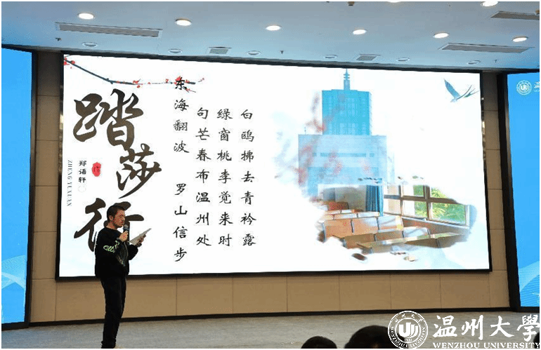 原创诗词环节,选手们神采飞扬,一一登台展示自己的作品,有格律对仗整齐的古体诗,也有自由奔放的现代诗。选手们或抒情婉转解说,或慷慨激昂诵读,充分展现了当代温大学子蓬勃向上的青春活力。观众席上掌声阵阵。