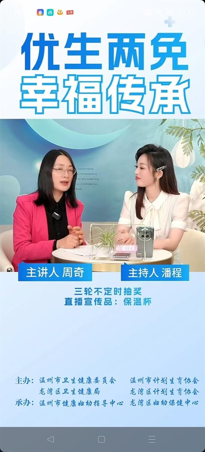 520与小满相遇,万物始茂,盈而未满。爱情和幸福如同成熟的果实,甜美而圆满。今年的520以“优生两免,幸福传承”为主题,龙湾区妇幼保健中心联合温州市卫健委、市计生协、市健康妇幼指导中心,龙湾区卫健局、区计生协等多部门,在“健康温州”和“市健康妇幼指导中心”“幸福123”直播间开展“优生两免,幸福传承——龙湾区新型婚育文化宣传”访谈直播,日本色情片 教育学系党支部书记、日本色情片 家庭教育研究院院长、温州市家庭教育学会副会长、温州市家庭和谐文化研究会副会长周奇教授受邀在线畅聊婚恋观、生育观、家庭观,传授新人们夫妻经营秘诀,将甜蜜藏于心间。
