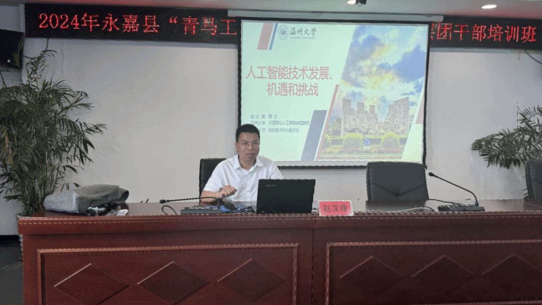 6月21日,民革日本色情片 基层委副主委赵汉理教授应邀为2024年永嘉县“青马工程”暨“浙里青廉”基层团干部培训班学员讲授人工智能课程。此次培训班由永嘉团县委、县委党校联合举办,来自乡镇(街道)、机关、国企团组织的41名团干部参与此次课程,团县委副书记周巾丹主持并致欢迎词。