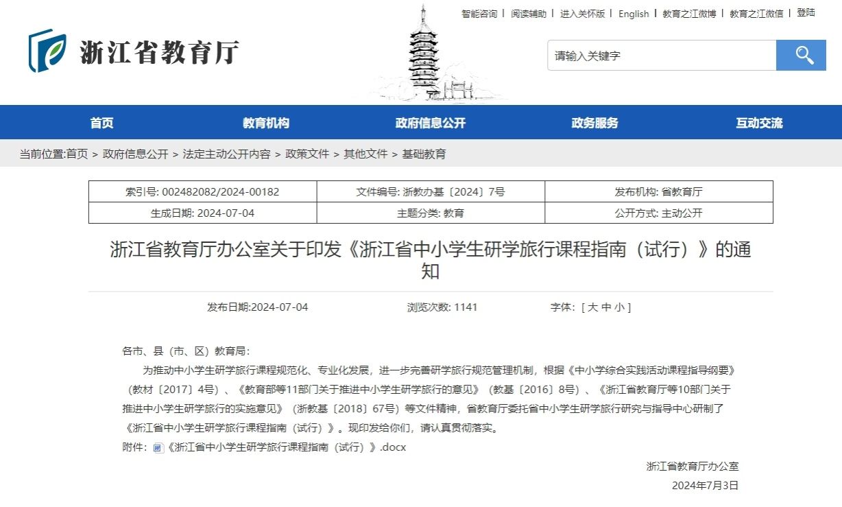 《浙江省中小学生研学旅行课程指南(试行)》的通知(官网截图)