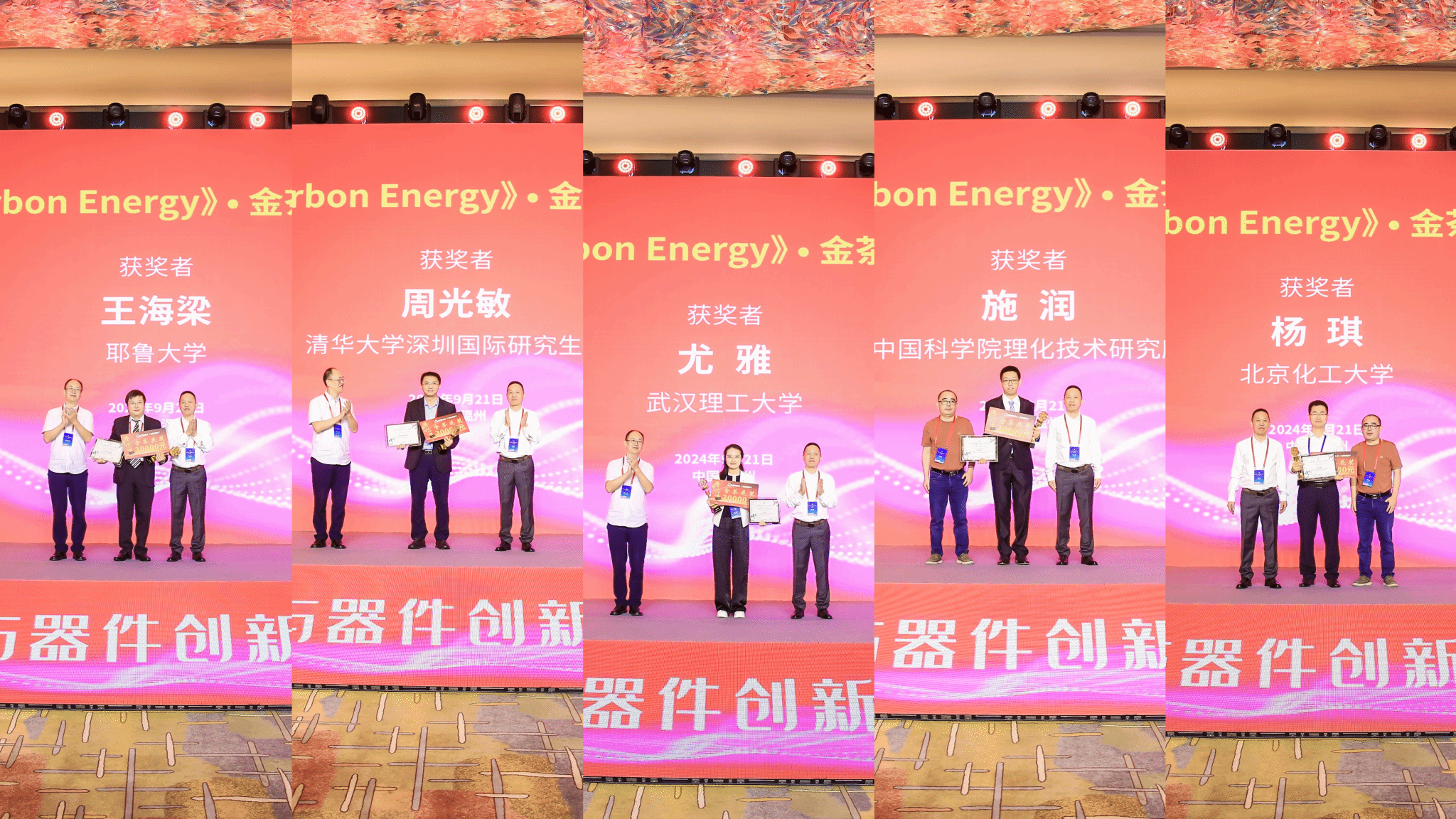 开幕式现场举行了中国科技期刊卓越行动计划“高起点新刊”《Carbon Energy》(碳能源)•金茶花奖颁奖仪式,该奖项为表彰在前沿研究领域作出贡献的40周岁以下的优秀青年科学家,共有耶鲁大学王海梁教授、清华大学周光敏教授、武汉理工大学尤雅教授、中国科学院理化技术研究所施润研究员、北京化工大学杨琪教授5位青年学者获奖。