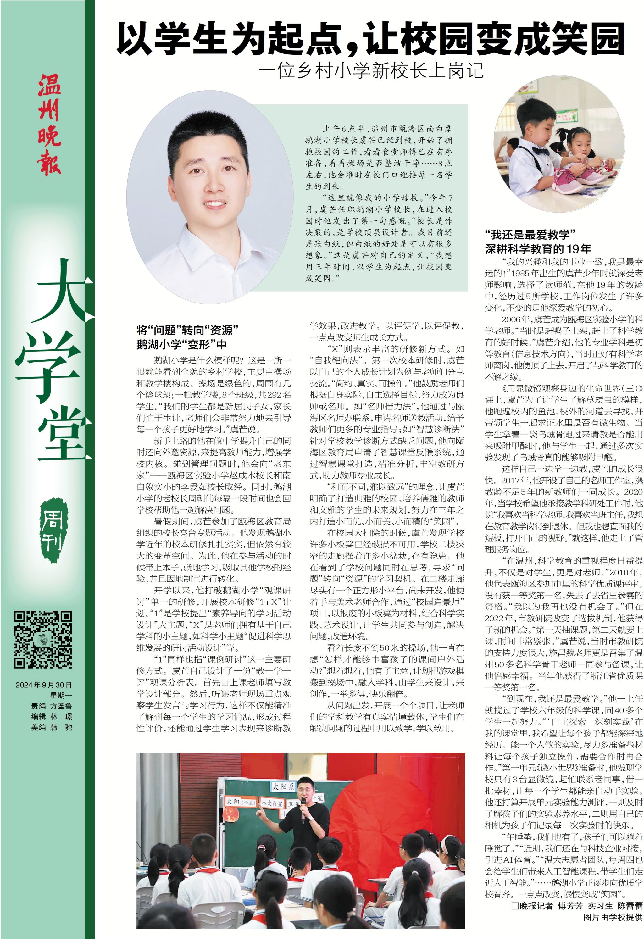 新手上路的他在做中学提升自己的同时还向外邀资源,来提高教师能力,增强学校内核。碰到管理问题时,他会向“老东家”——瓯海区实验小学赵成木校长和南白象实小的李爱茹校长取经。同时,鹅湖小学的老校长周朝伟每隔一段时间也会回学校帮助他一起解决问题。