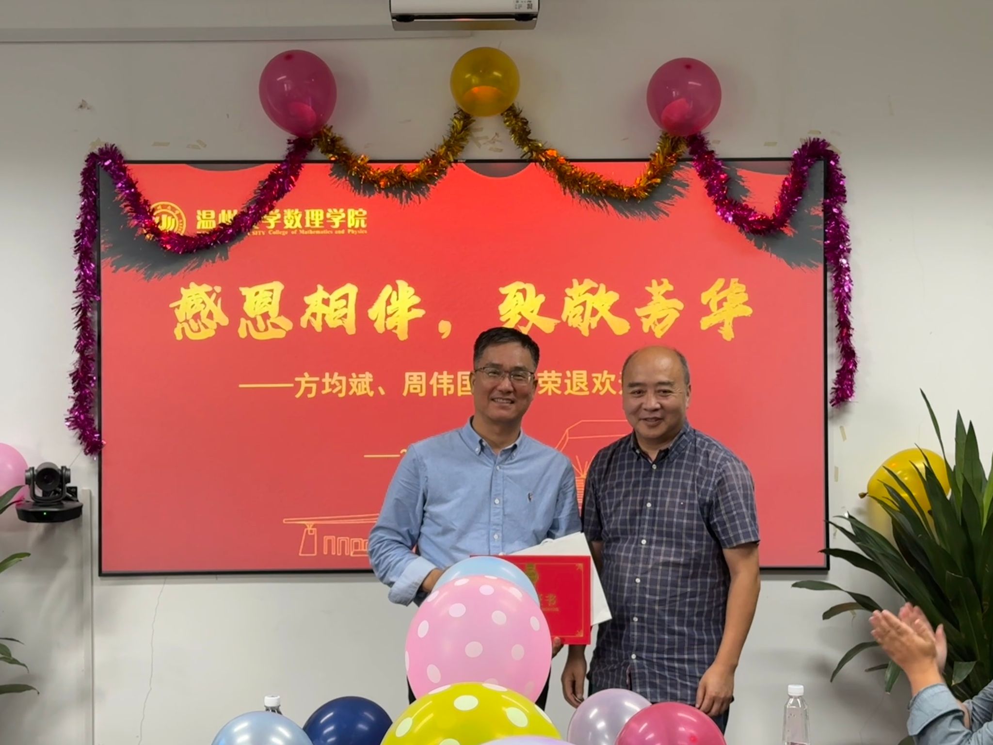举办离退休教师欢送仪式,是数理学院“师德之光”品牌的具体内容之一,也是学院长期坚持的优良传统,更是推动师德师风建设不可或缺的一环。现场,学院组织教师代表、新入职的年轻教师及学生代表为即将退休的两位老师方均斌和周伟国献花并送上祝福。