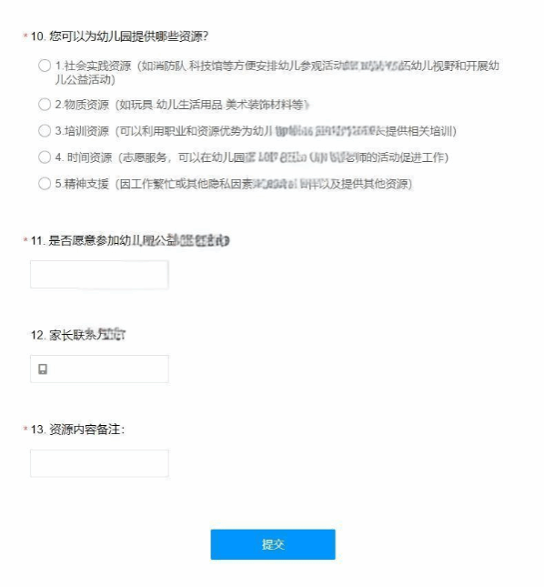 据家长所述,这份调查是由家长委员会发出的,并非教师团队。该问卷调查共包含13项内容,包括“爸爸就职单位”“爸爸职位”“爸爸爱好特长”“妈妈就职单位”“妈妈职位”“妈妈的爱好特长”等信息。除此之外,调查还询问了家长可以为幼儿园提供的资源类型,如,社会实践资源:例如消防队、科技馆等,方便安排幼儿参观活动,旨在拓宽幼儿视野和开展公益活动;物质资源:如玩具、幼儿生活用品、美术装饰材料等;培训资源:可以利用家长的职业和资源优势,为幼儿或家长提供相关培训;时间资源:志愿服务,可以在幼儿园开展活动时协助园里老师促进工作;精神支援:因工作繁忙或其他隐私因素无法经常陪伴或提供其他资源。