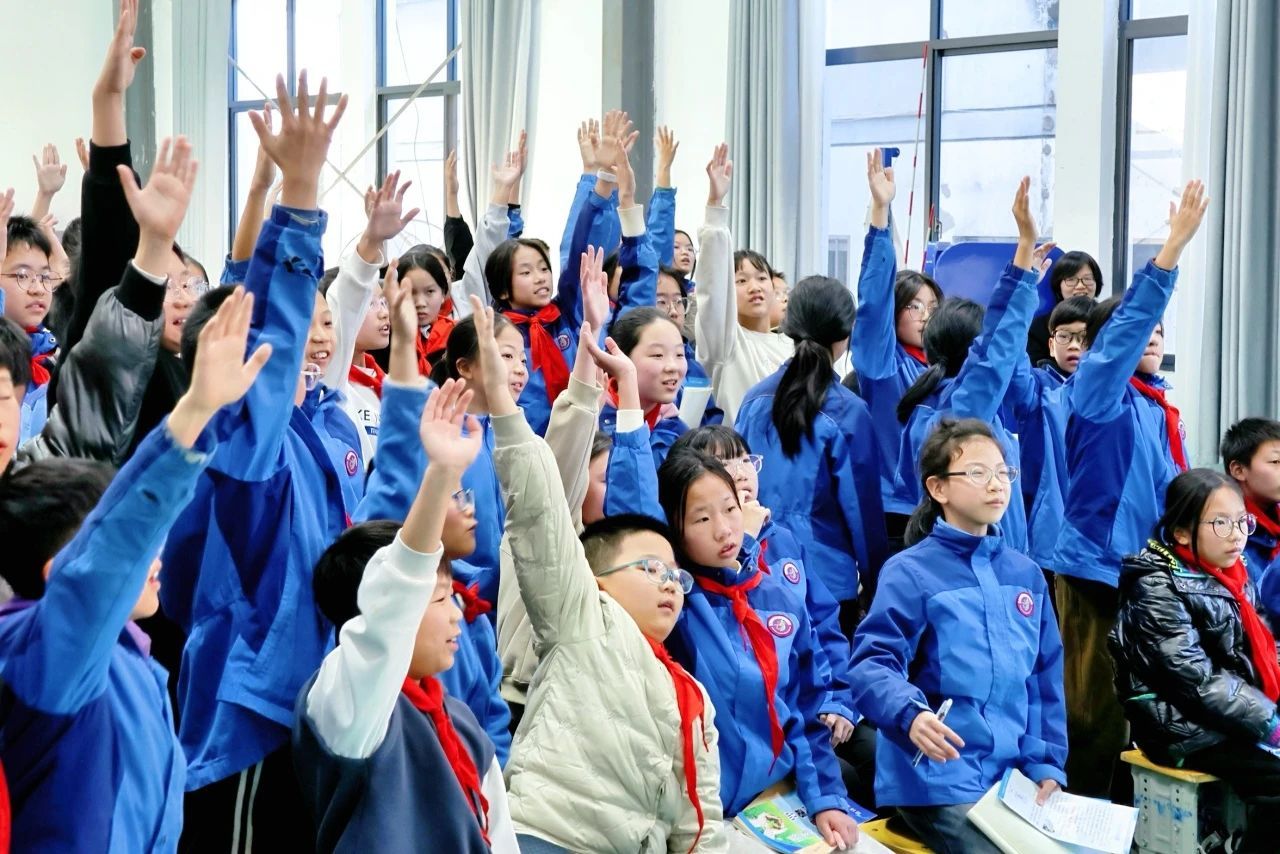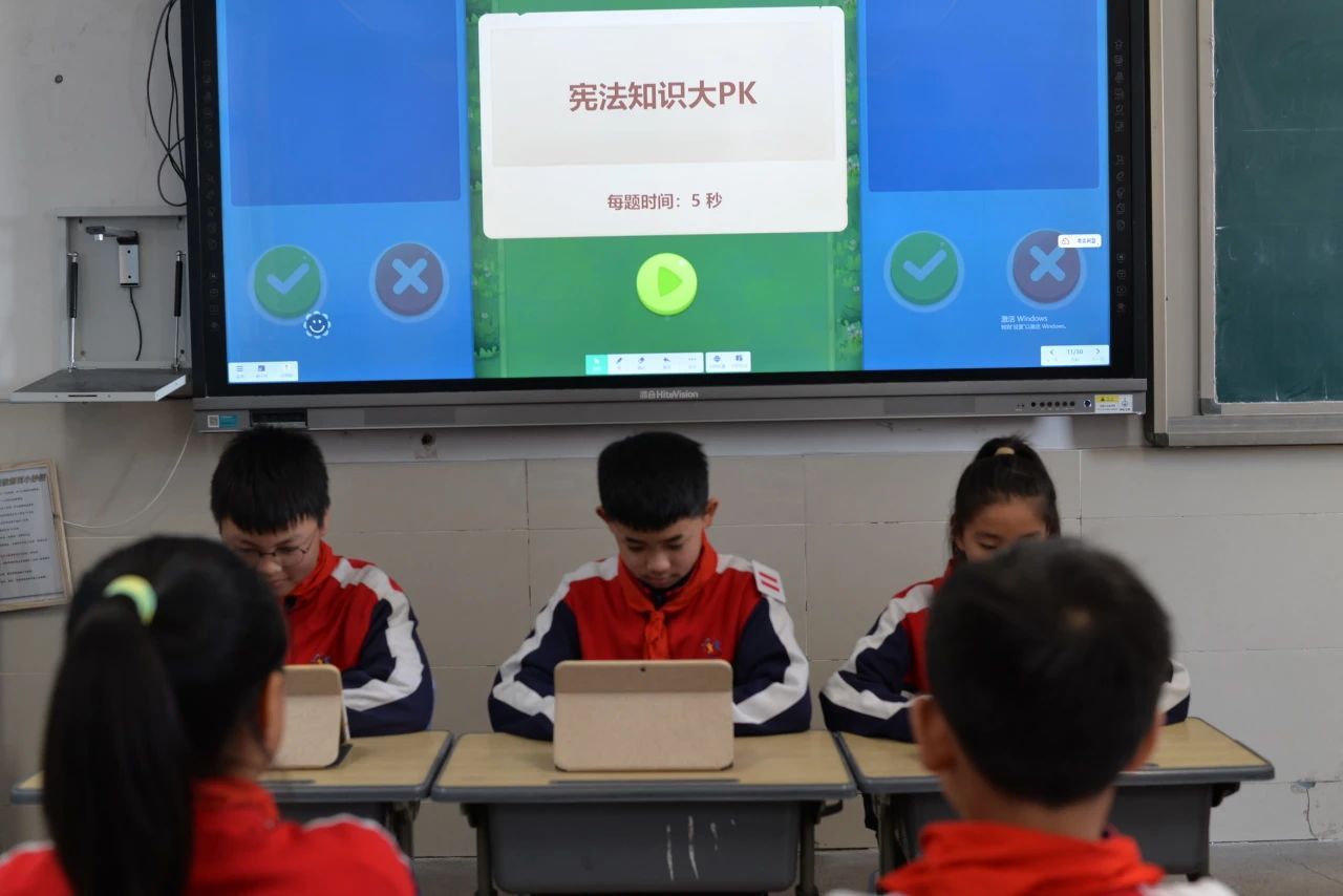 在班队课上,湖州市织里镇晟舍小学组织学生进行“学宪法、讲宪法”知识竞赛大PK,寓教于乐,进一步弘扬宪法精神,让宪法的种子在孩子们心中生根发芽。