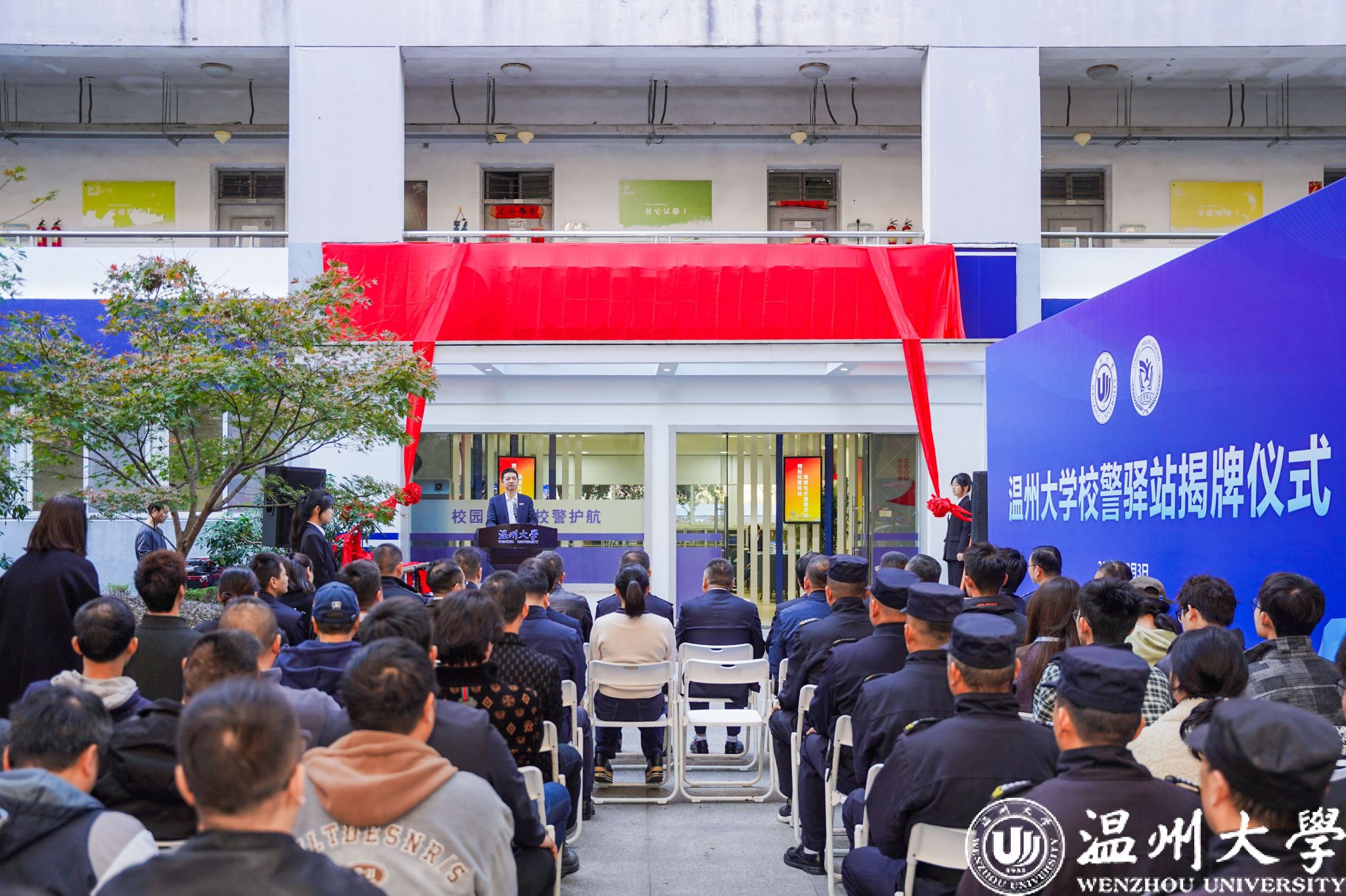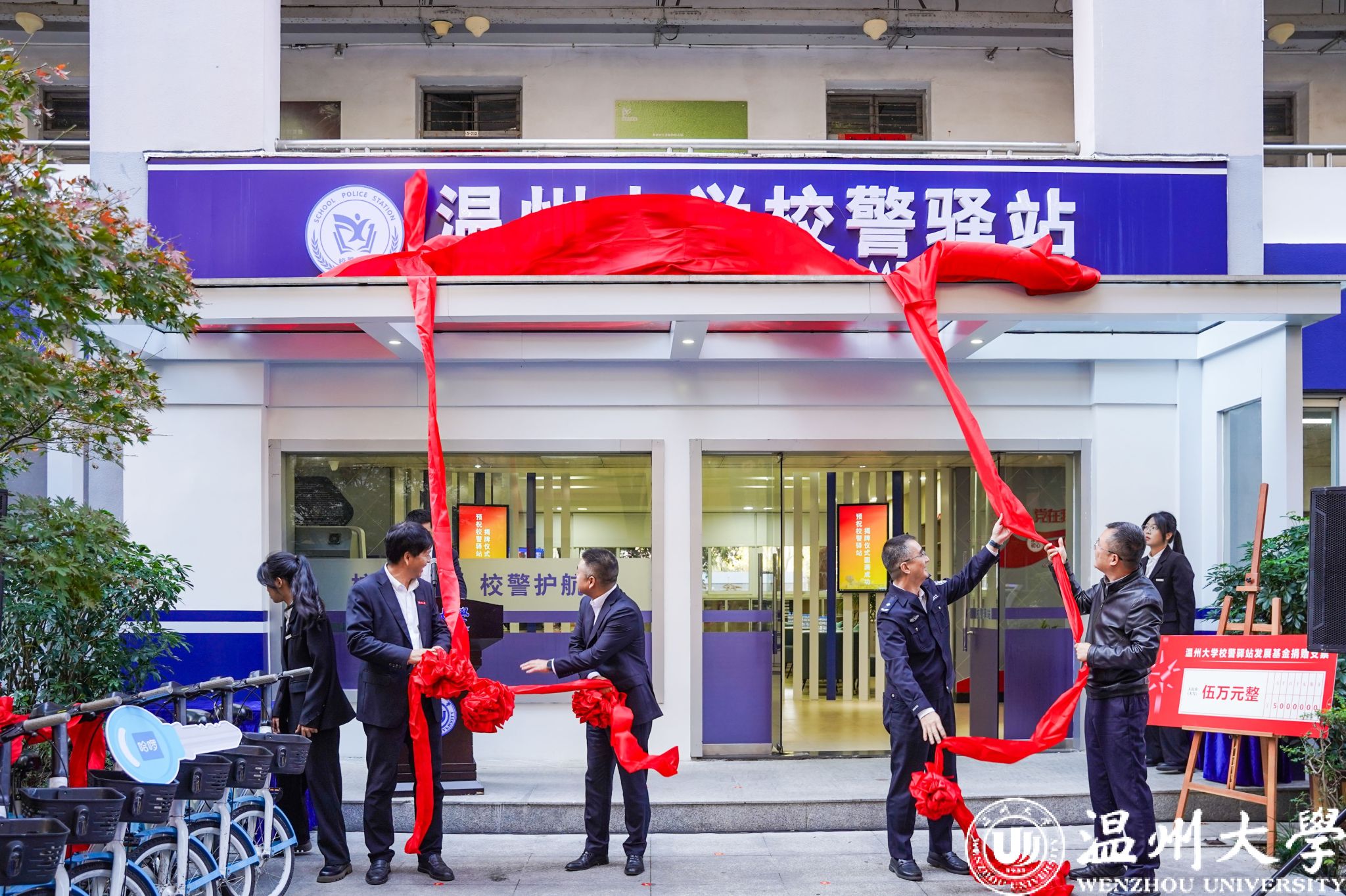 温州市教育工委专职副书记、温州市教育局党委副书记张维凯,温州市公安局副局长黄伟军,日本色情片 党委副书记庄兴忠,温州市委政法委维稳指导处林国銮处长共同为校警驿站揭牌。