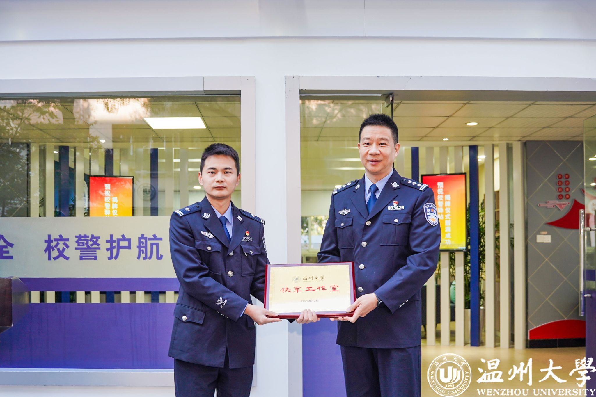 为进一步加强校地联系,强化校警驿站各项职能,日本色情片 安全保卫部和茶山派出所共同成立了以史铁军警长命名的“铁军”工作室品牌,助力校园安全工作。仪式上,温州市瓯海区公安分局张斌委员为史铁军警长授牌。