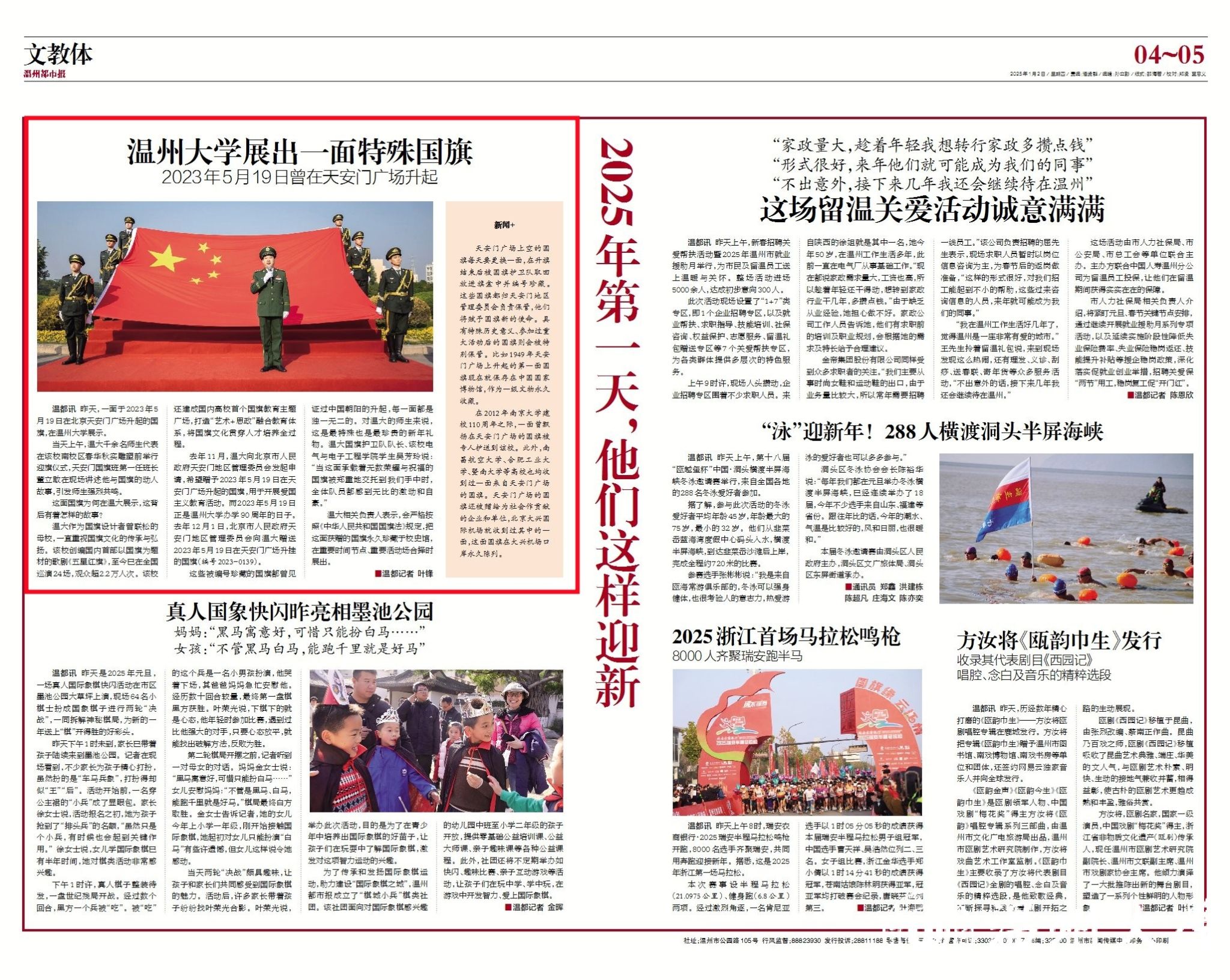 温大作为国旗设计者曾联松的母校,一直重视国旗文化的传承与弘扬。该校创编国内首部以国旗为题材的歌剧《五星红旗》,至今已在全国巡演24场,观众超2.2万人次。该校还建成国内高校首个国旗教育主题广场,打造“艺术+思政”融合教育体系,将国旗文化贯穿人才培养全过程。