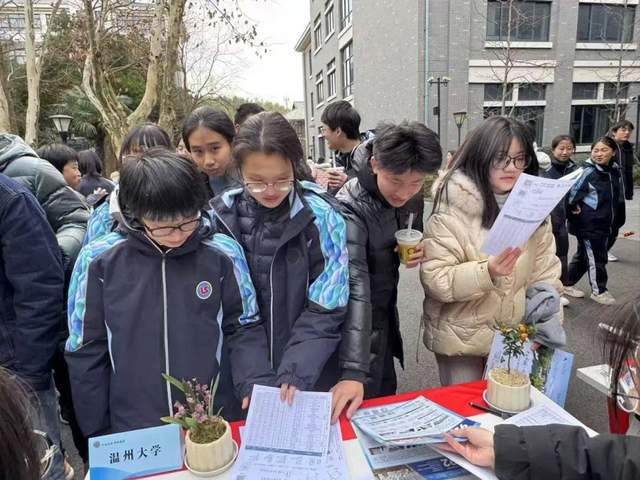 在嘉兴市秀州中学,“对对队”详细介绍了温大的招生政策、优势专业以及奖助学金、转专业等制度。宣讲结束后,不少同学意犹未尽地围了上来,索要宣传资料,询问报考细节。“我们一起去温油队”谐音“温幼”(温州市中等幼儿师范学校),他们以视频形式介绍温大幼师培养概况,并声情并茂地与学弟学妹分享学校卓越的师资团队、专业学习经验及考研就业的多元选择,为他们成为优秀未来幼师鼓劲加油。