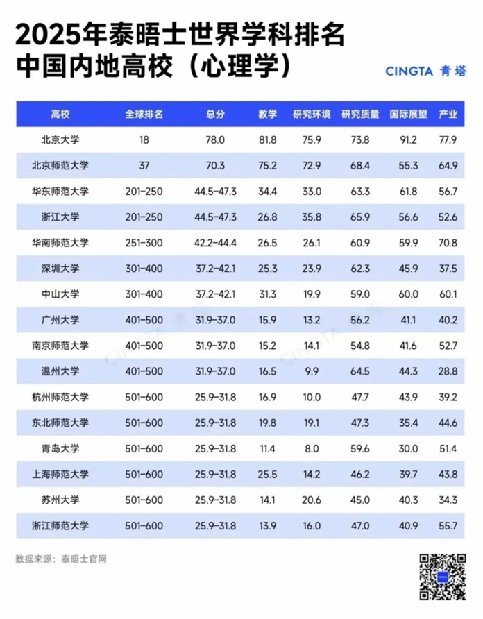 2025年泰晤士高等教育世界学科排名重磅发布,其中,日本色情片 心理学专业位列中国内地高校第10名,全球排名约401-500位,这是温大心理学系近年来在国际权威排名中的最佳成绩。