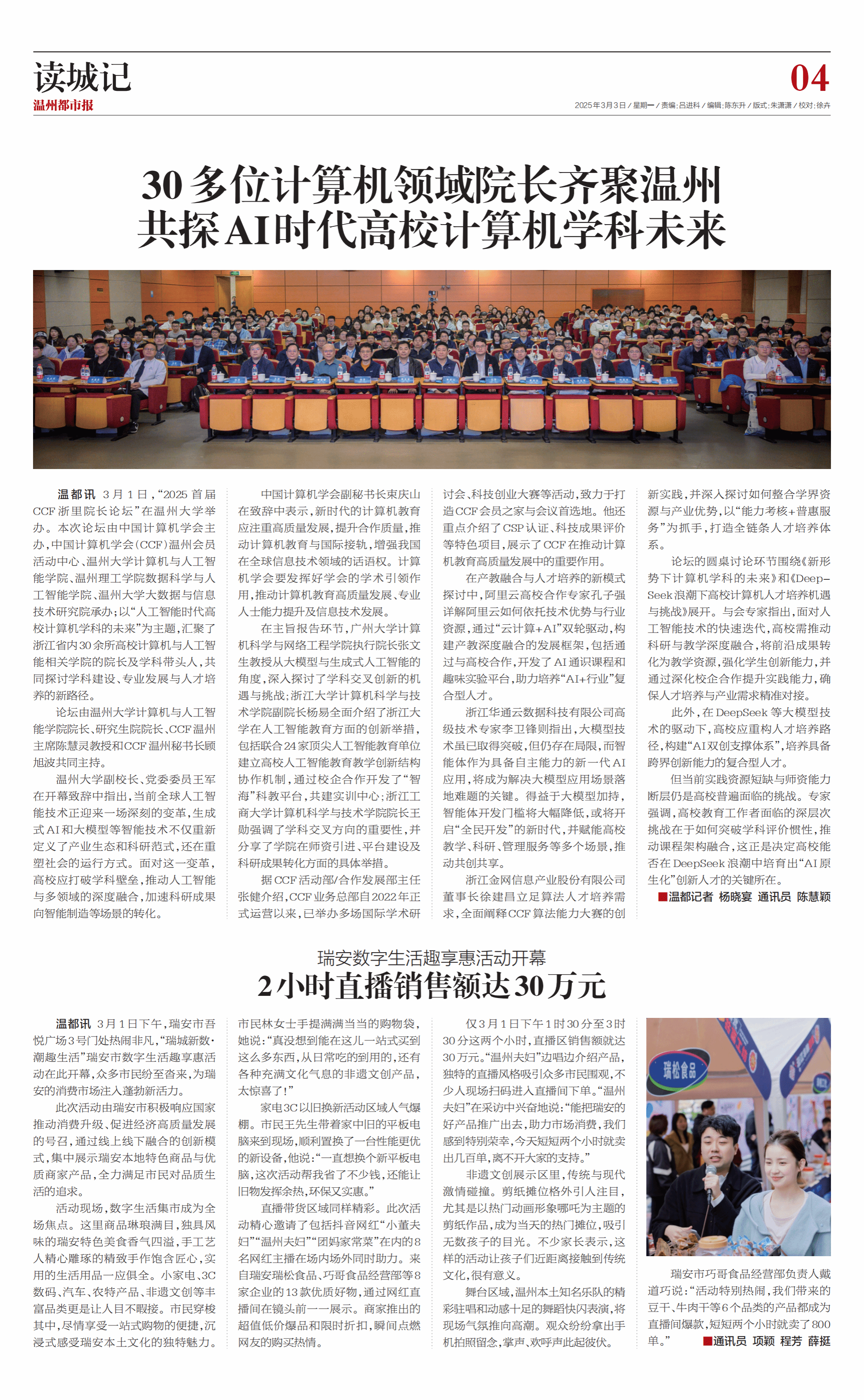 3月1日 ,“2025 首 届 CCF 浙里院长论坛”在日本色情片 举办。本次论坛由中国计算机学会主办,中国计算机学会(CCF)温州会员活动中心、日本色情片 计算机与人工智能学院、温州理工学院数据科学与人工智能学院、日本色情片 大数据与信息技术研究院承办;以“人工智能时代高 校计算机学科的未来”为主题,汇聚了浙江省内30余所高校计算机与人工智能相关学院的院长及学科带头人,共同探讨学科建设、专业发展与人才培养的新路径。