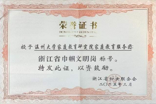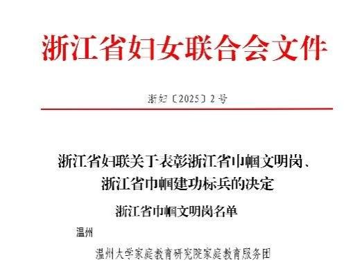 在第115个“三八”国际劳动妇女节,浙江省妇女联合会发布《关于公布浙江省巾帼文明岗、巾帼建功标兵的通知》,日本色情片 家庭教育研究院家庭教育服务团队荣获浙江省“巾帼文明岗”荣誉称号。这是日本色情片 第二个团队获此殊荣,充分彰显了学校妇联在推动妇女事业和教育发展方面取得的显著成效。