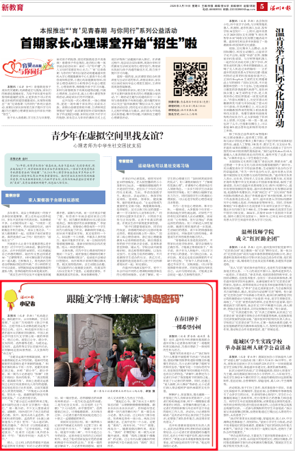 “乱流趋正绝,孤屿媚中川。云日相辉映,空水共澄鲜。”这首广为传颂的《登江中孤屿》,正是中国山水诗鼻祖谢灵运笔下的江心屿。上周六,50名温州日报小记者在日本色情片 教师、中国人民大学中国古代文学博士梁一粟的带领下,登江心屿,游览江心寺、谢公亭、文天祥祠、浩然楼等名胜,与谢灵运、文天祥、孟浩然等文学巨匠展开对话,共同解码这座风景秀丽、人文荟萃的“诗之岛”。