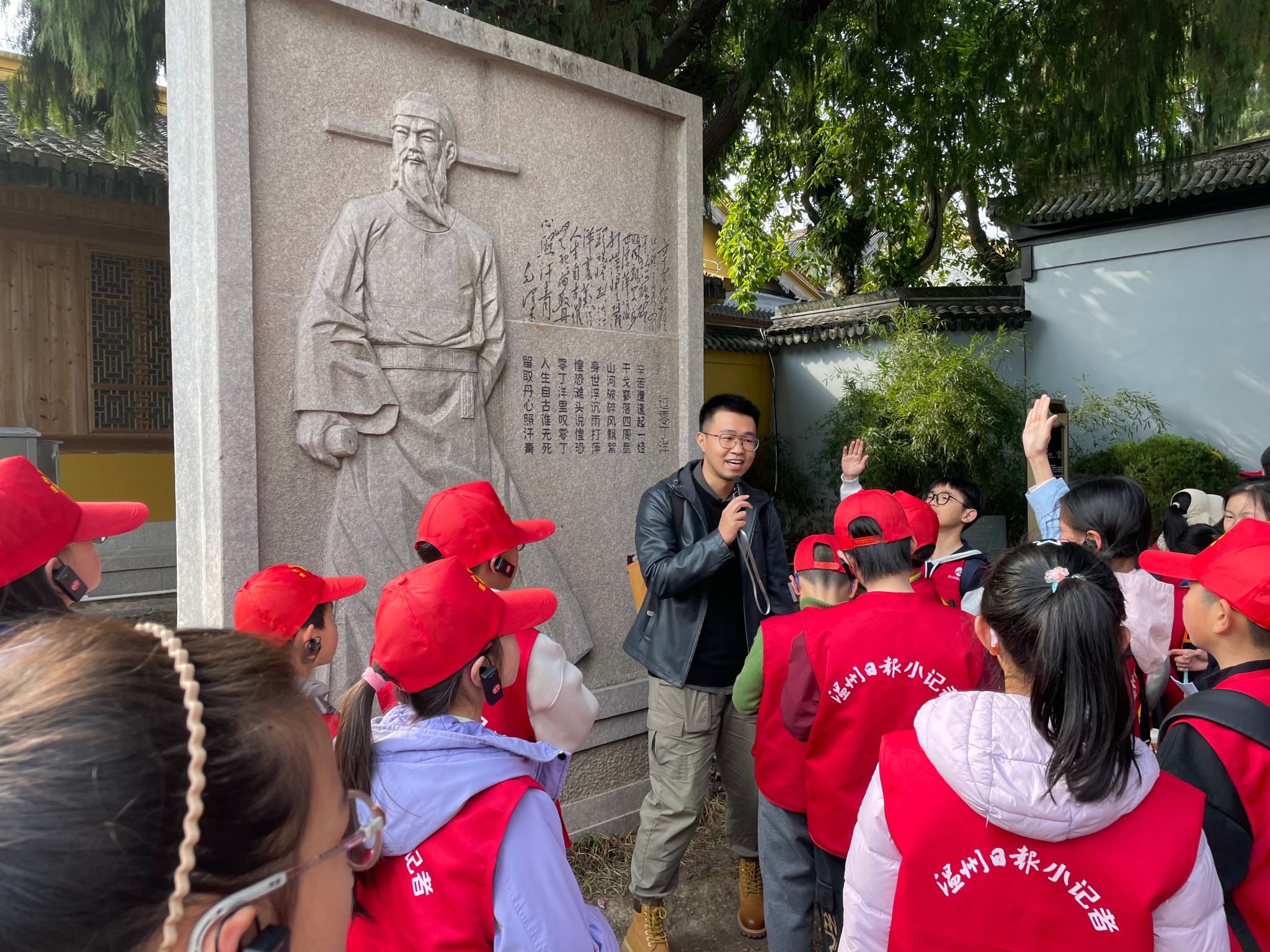 来到宋文信国公祠,梁一粟还带领小记者齐声朗诵了文天祥的《过零丁洋》和《北归宿中川寺》。“‘乘潮一到中川寺,暗度中兴第二碑’,中川寺是江心寺的前身,这首诗是文天祥在江心屿时所作,表达了他对国家岌岌可危的悲痛和图谋中兴宋室的志向。”在梁一粟的逐字解读下,小记者李统翊感叹,爱国诗人文天祥把人生活出了价值。