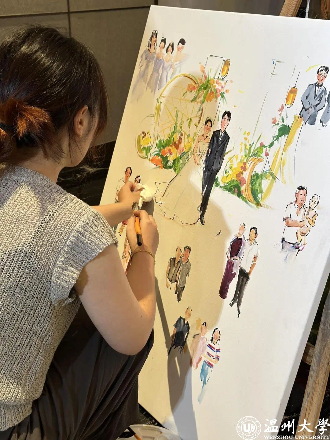 冯奕涵,之前曾担任画室教师,并在网络上承接插画工作。然而,自从她涉足婚礼绘画师这一职业,便深感其与自身特质相契合。她具备迅速的绘画能力,而记录婚礼现场最适宜的画作形式——油画,正是她所擅长的。
