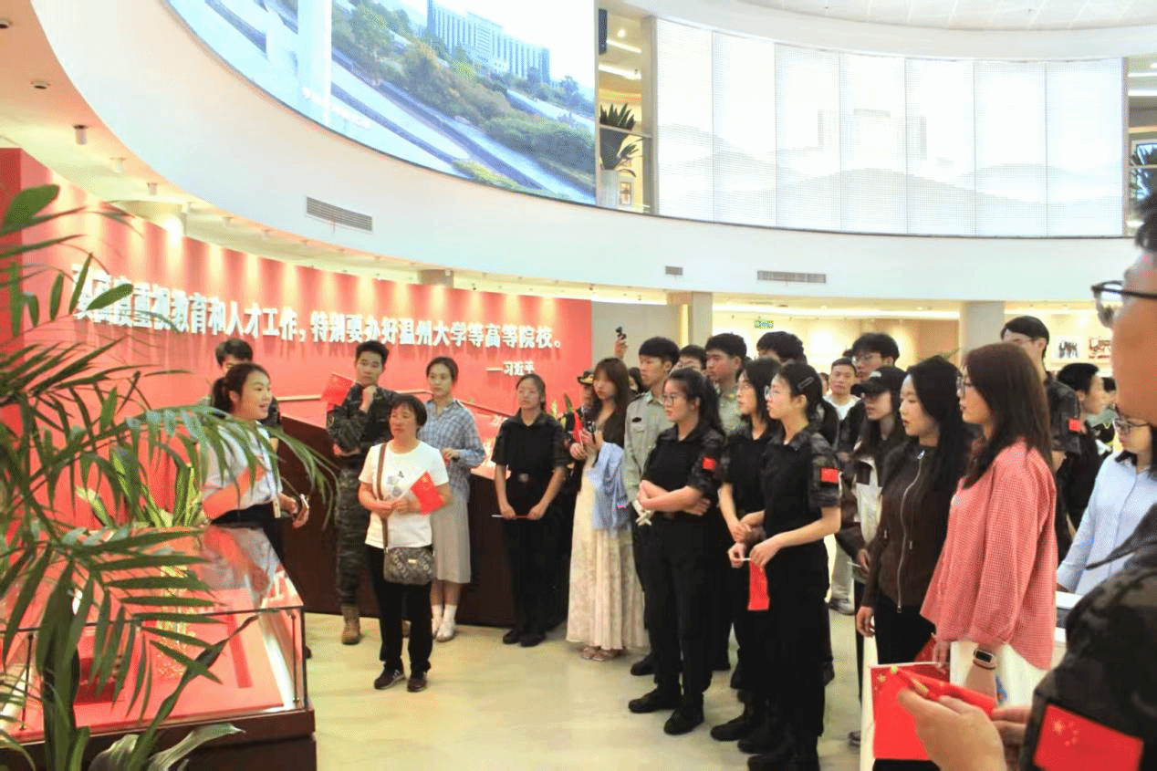 合唱结束后,师生们有序前往校史馆,瞻仰那面曾于2023年5月19日(温大90周年校庆日)在天安门广场升起的特殊国旗。一名学生感慨“这面国旗是温大与祖国同频共振的见证,更是我们青年学子奋进新征程的精神旗帜。”此刻,这面旗不再只是一件展品,而是连接历史与当下、点燃青年爱国情怀的精神纽带,激励着在场的每一位学子传承五四精神,勇担时代使命。