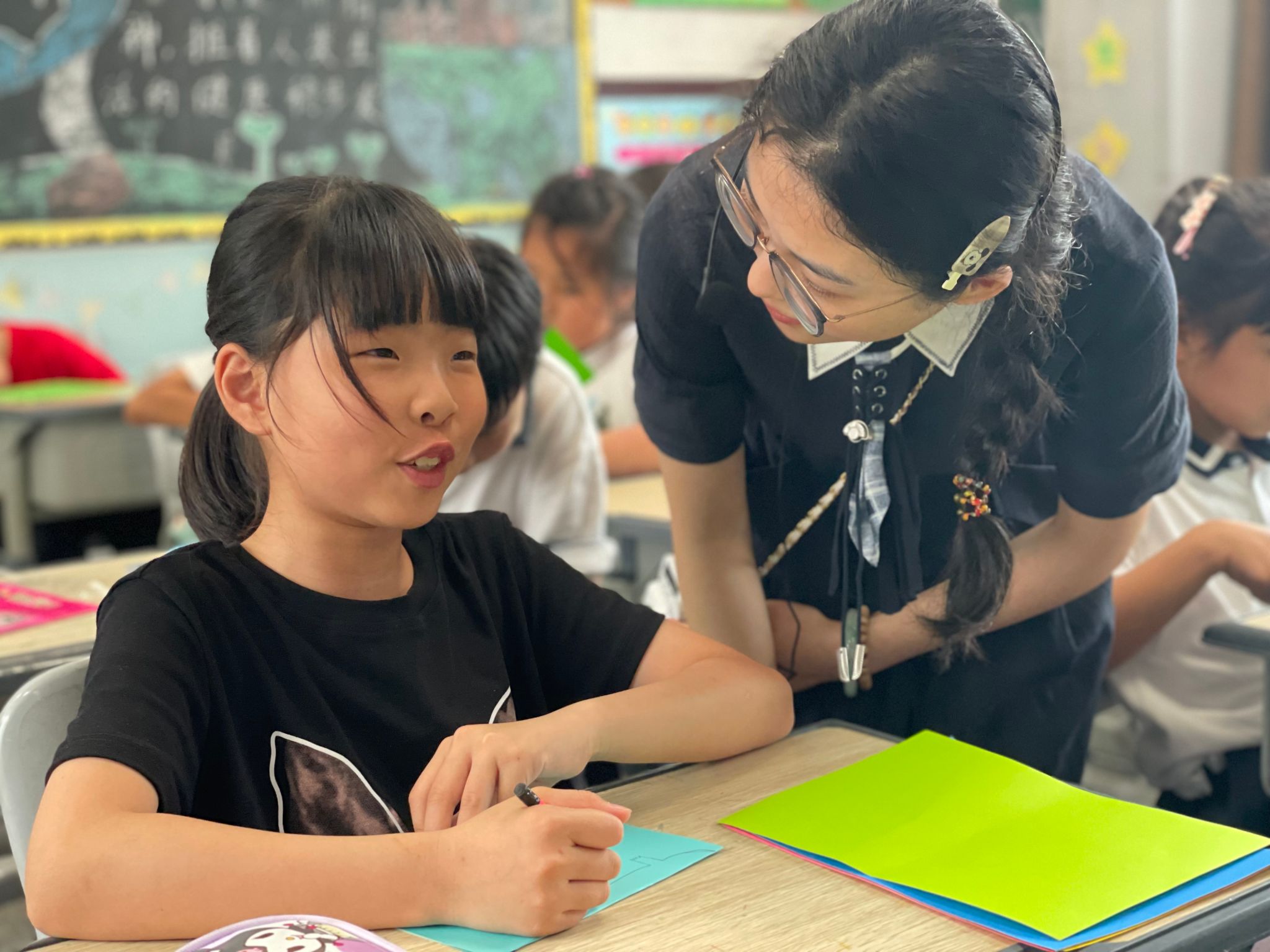 “我要折一座彩虹桥,让所有动物都能成为朋友!”在最后的折纸创作环节,一位小女孩兴奋地展示自己的作品。孩子们的折纸作品充满童趣与创意:有的给鳄鱼折了一条彩虹尾巴,象征它的与众不同;有的用彩纸制作了咕叽咕叽的“保护徽章”,代表着勇气与责任。这些简单却饱含深意的作品,折射出孩子们对包容与共存的朴素理解。谢老师欣慰地轻抚每个孩子的作品,这一刻,教室里流淌着温暖与理解,就像咕叽咕叽带给小鸭们的温暖怀抱。