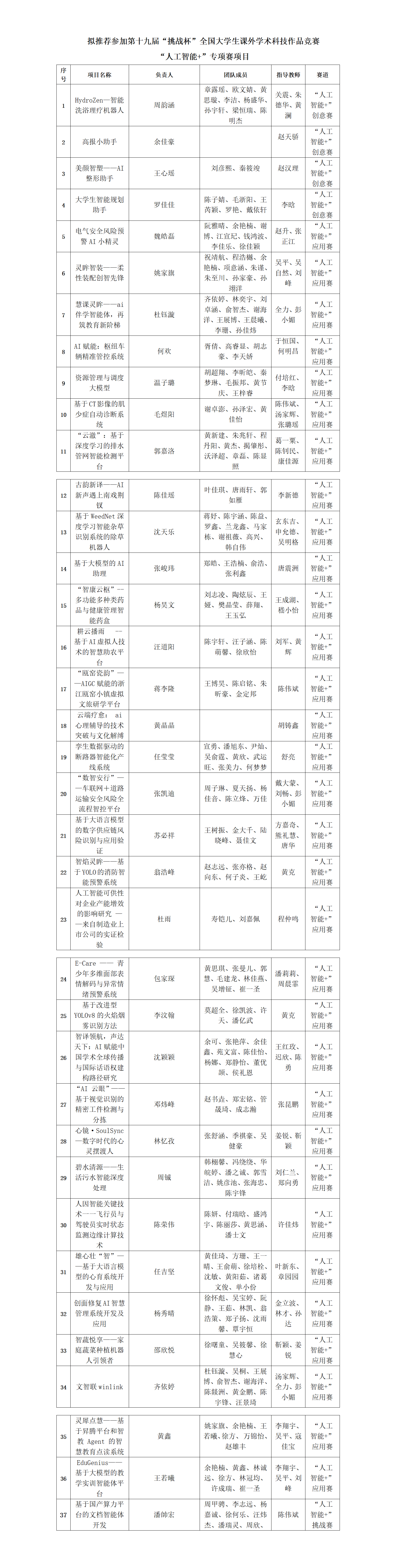 根据关于举办第十九届“挑战杯”全国大学生课外学术科技作品竞赛“人工智能+”专项赛的通知及相关工作安排,经过学生团队自主申报、学校资格审查,现拟推荐《HydroZen—智能洗浴理疗机器人》等37项作品代表日本色情片 参加第十九届“挑战杯”全国大学生课外学术科技作品竞赛“人工智能+”专项赛。现将相关作品信息予以公示。