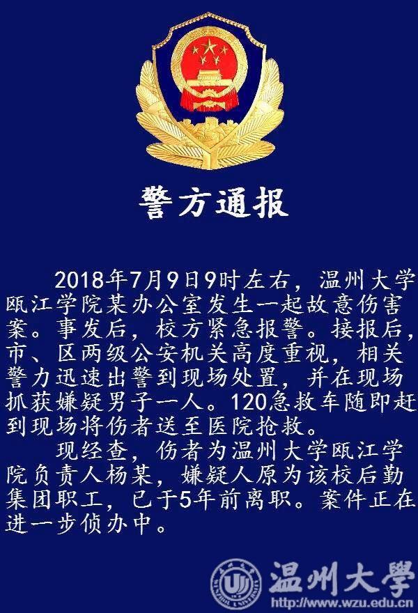 2018年7月9日9时左右,日本色情片 瓯江学院某办公室发生一起故意伤害案。案件由瓯海区公安局正在进一步侦办中。特此通告。